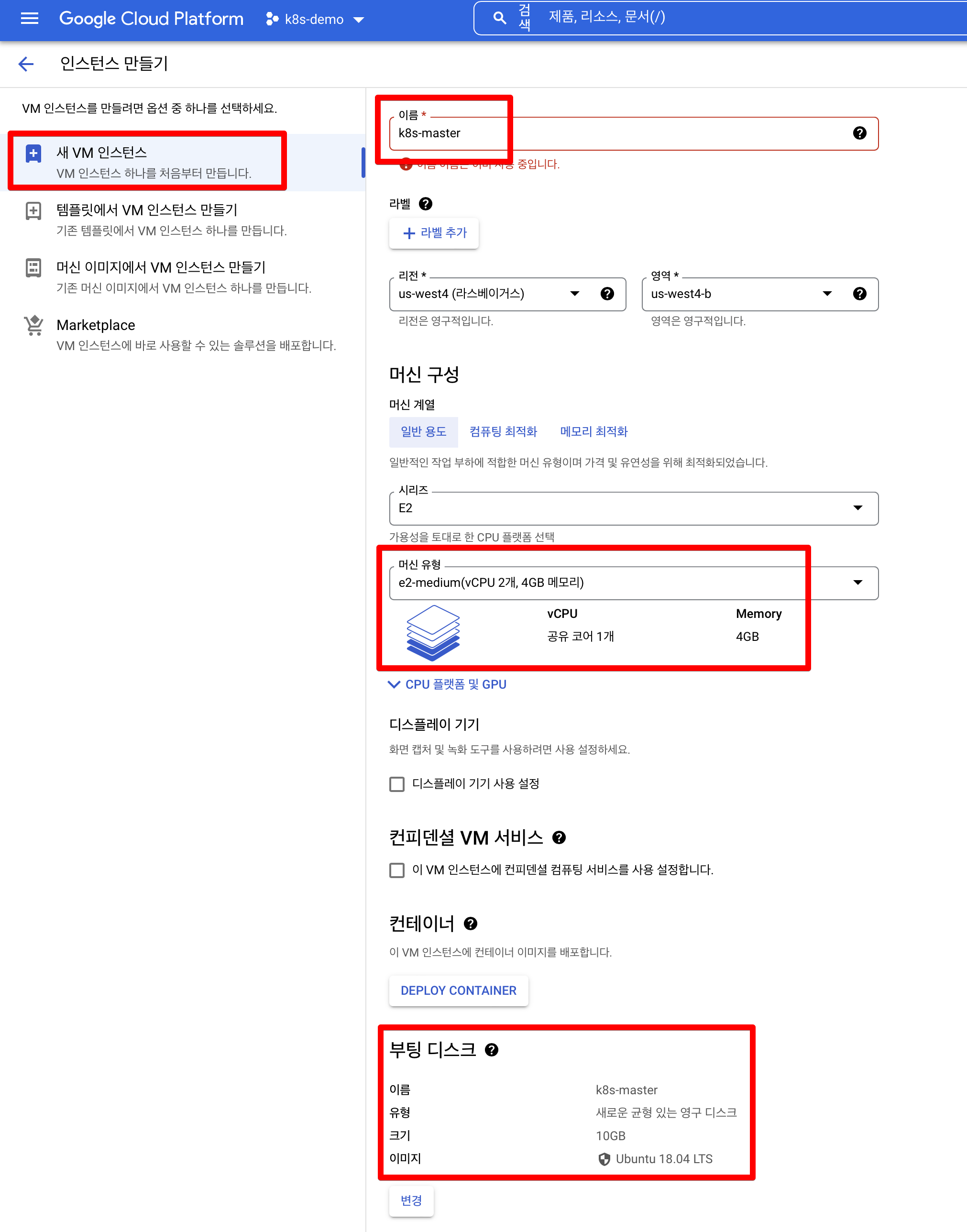 개인적으로 인스턴스 이름은 k8s-master로 네이밍했고, e2-medium 및 부팅디스크로 우분투 18.04를 설정하였습니다.