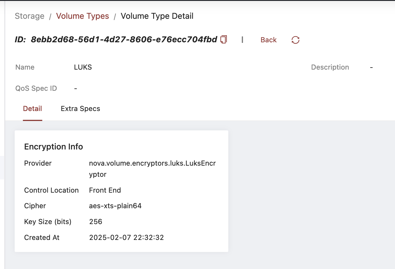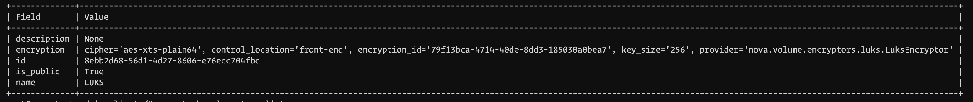 openstack volume type create --encryption-provider nova.volume.encryptors.luks.LuksEncryptor --encryption-cipher aes-xts-plain64 --encryption-key-size 256 --encryption-control-location front-end LUKS