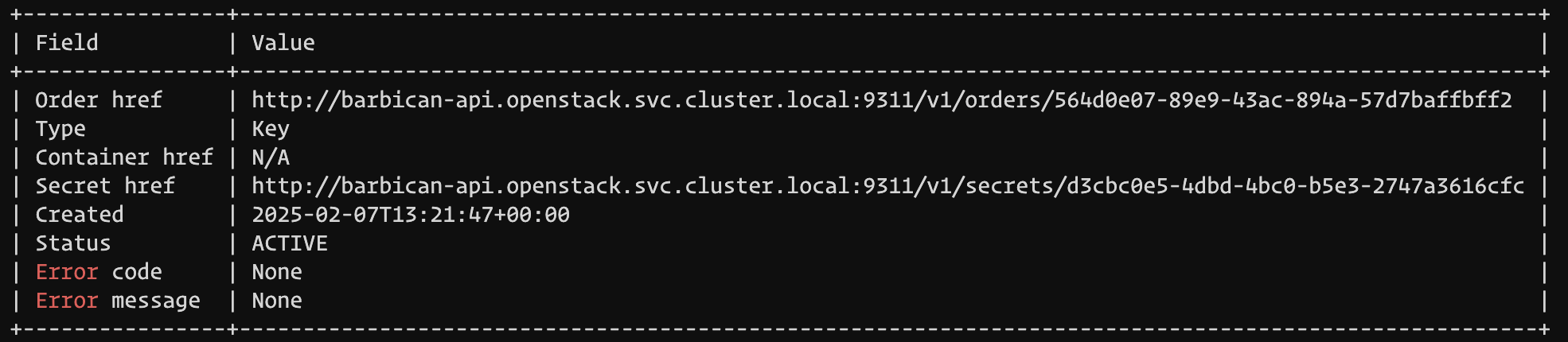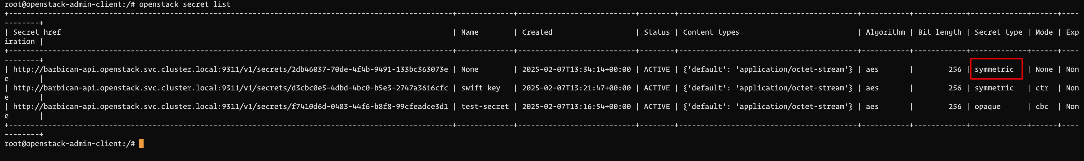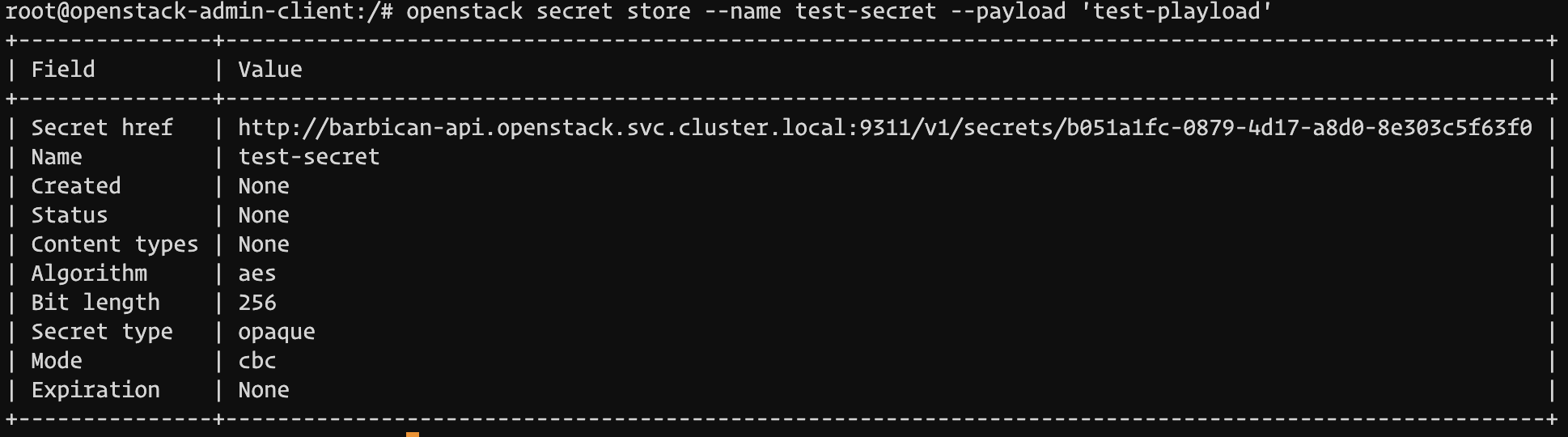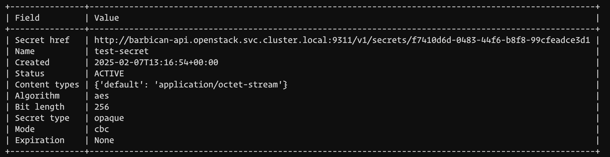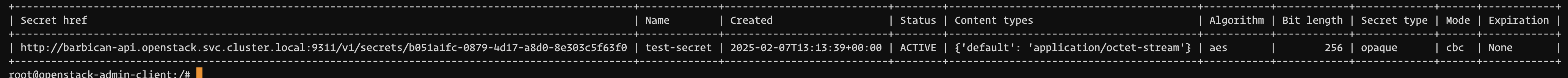 openstack secret get http://barbican-api.openstack.svc.cluster.local:9311/v1/secrets/f7410d6d-0483-44f6-b8f8-99cfeadce3d1