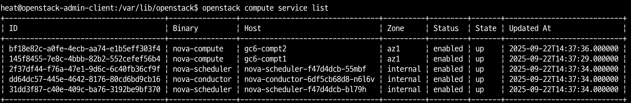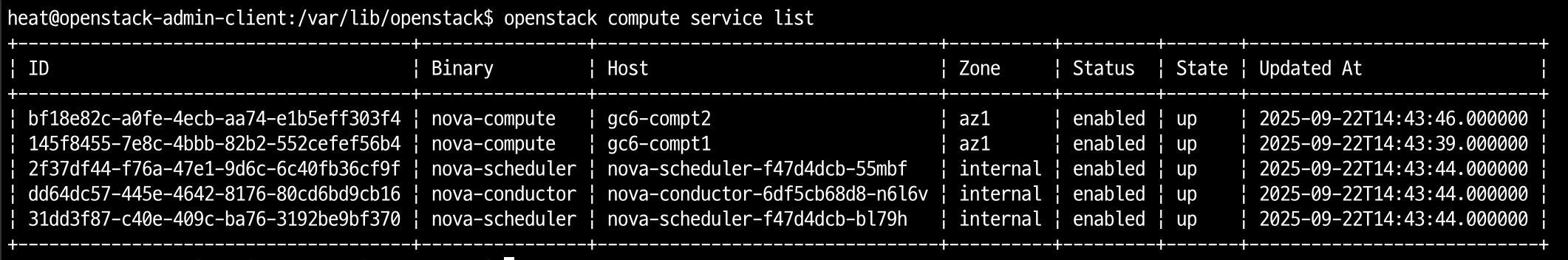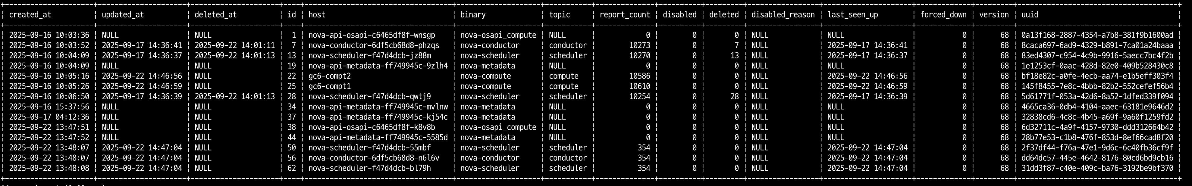 | bf18e82c-a0fe-4ecb-aa74-e1b5eff303f4 | nova-compute | gc6-compt2 | az1 | enabled | down | 2025-09-22T13:59:16.000000 |